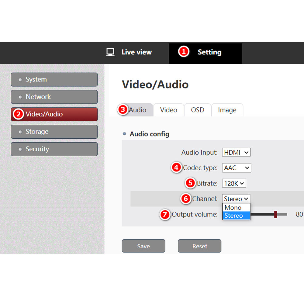 - Cross Browsers - Real cross browers supported like IE, Microsoft Edge, Google Chrome, Firefox, Safari etc. With user-friendly UI, you can also preview live video directly over browsers, set audio as AAC, bitrate as 500(recommended), insert your logo(jpg at 200x200px) and OSD text, and remote upgrade etc.
