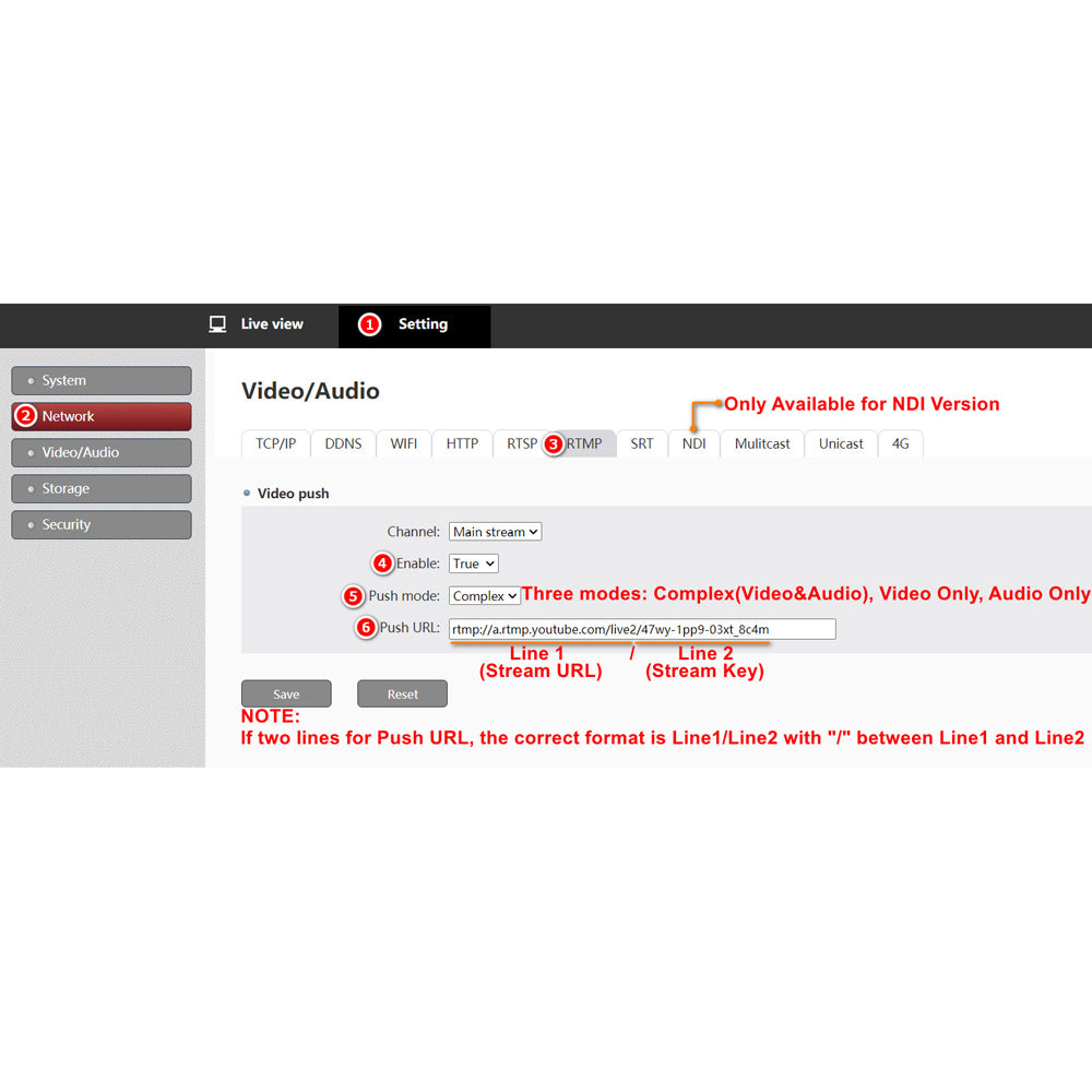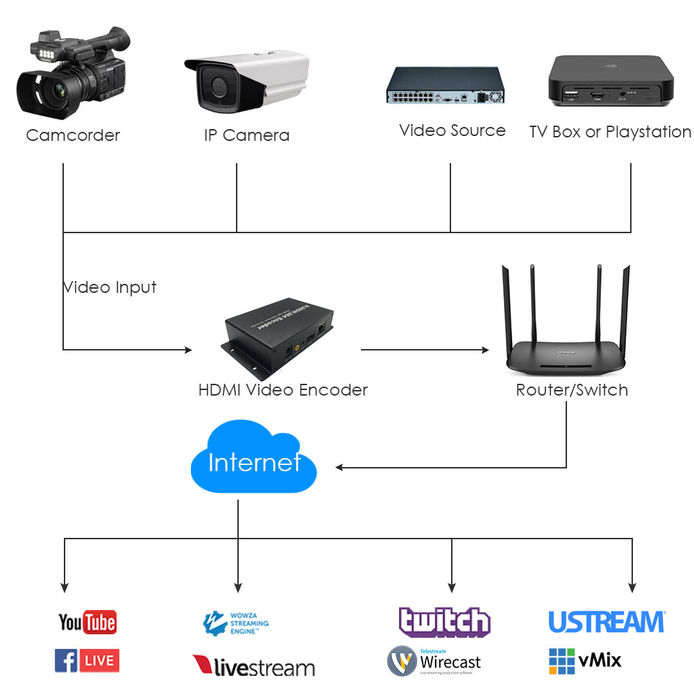 - Multiple Broadcasting - Suitable not only for pulling stream to your own server via TS (H.265/H.264 supported) like IPTV, but also for pushing stream via RTMP (H.264 only supported) to Wowza Streaming Engine, YouTube, Twitch, Ustream, Facebook Live, Livestream, Wirecast, vMix etc. to do broadcasting. It also supports stream pushing via dual addresses.